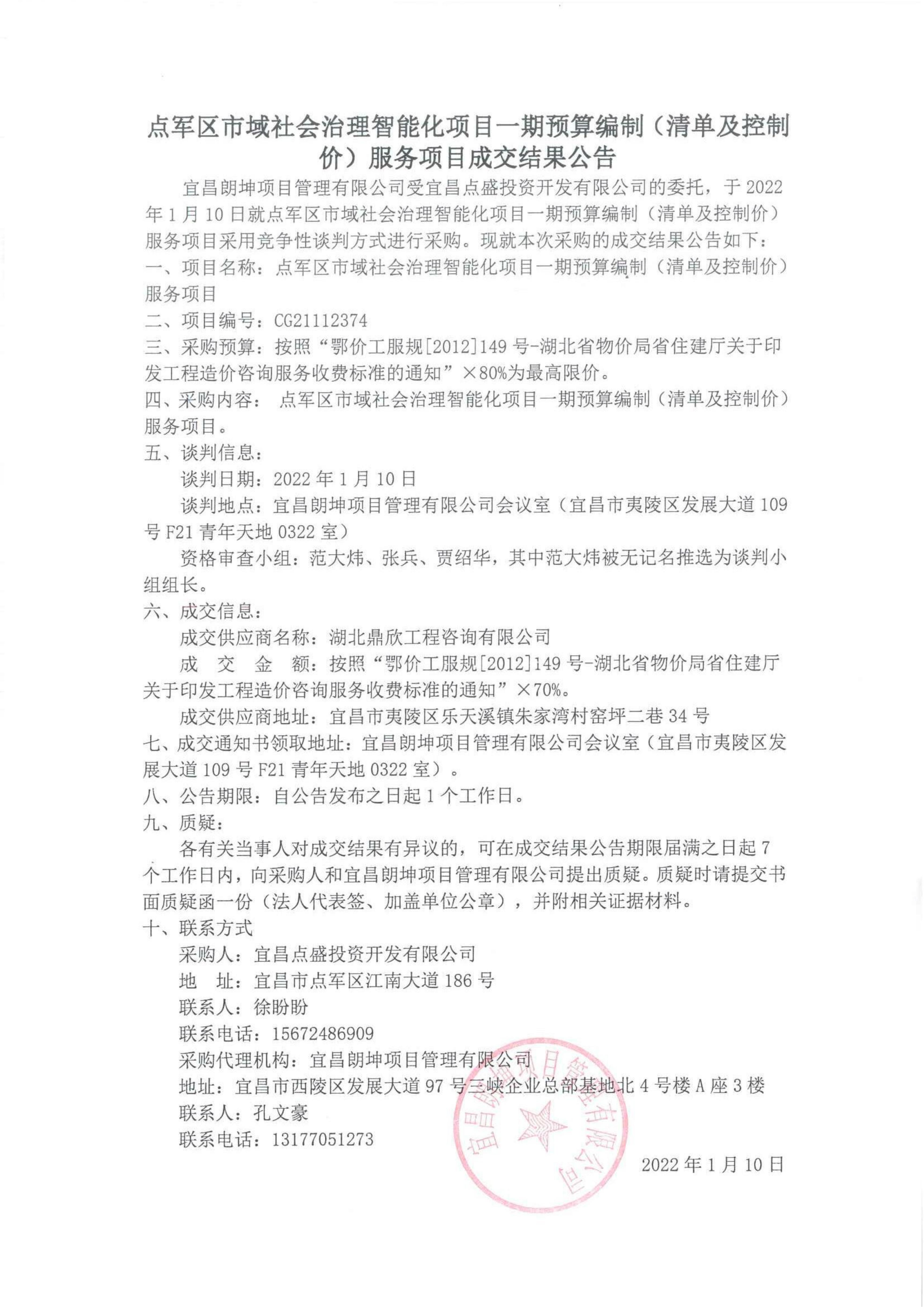 點(diǎn)軍區(qū)市域社會治理智能化項(xiàng)目一期預(yù)算編制(清單及控制價(jià))服務(wù)項(xiàng)目成交結(jié)果公告