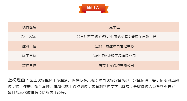(通訊員:徐文剛、吳鵬翔)為進一步貫徹落實《宜昌市揚塵污染防治條例》《宜昌市城區(qū)建設(shè)工程文明施工管理紅黑榜制度(試行)》,強化建筑工地文明施工管理,壓實建設(shè)單位文明施工主體責(zé)任,鼓勵文明施工先進典型,打擊和曝光不文明施工違法行為,結(jié)合建筑工地實名制管理、關(guān)鍵崗位人員到崗履職相關(guān)要求,宜昌市住建局組織評選了2022年第七期建筑工程安全文明施工管理“紅黑榜”。點盛投資開發(fā)有限公司代建項目江南三路,成為點軍區(qū)唯一獲評紅榜的市政項目。
