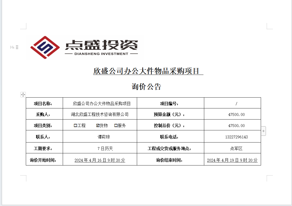 欣盛公司辦公大件物品采購(gòu)項(xiàng)目詢(xún)價(jià)公告