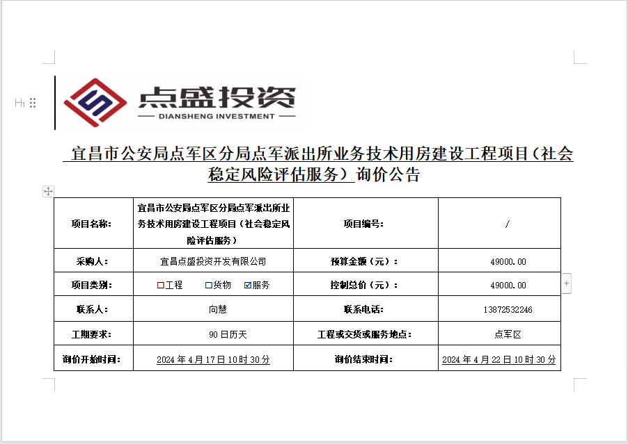 宜昌市公安局點(diǎn)軍區(qū)分局點(diǎn)軍派出所業(yè)務(wù)技術(shù)用房建設(shè)工程項(xiàng)目(社會(huì)穩(wěn)定風(fēng)險(xiǎn)評(píng)估服務(wù))詢價(jià)公告