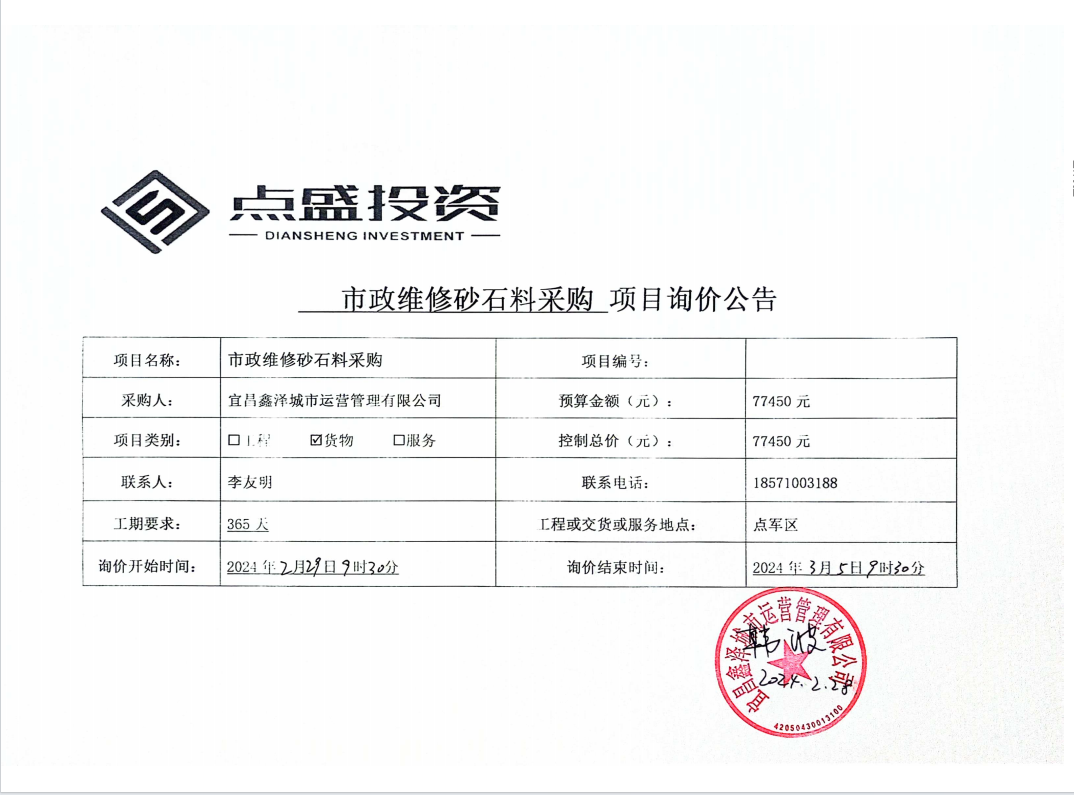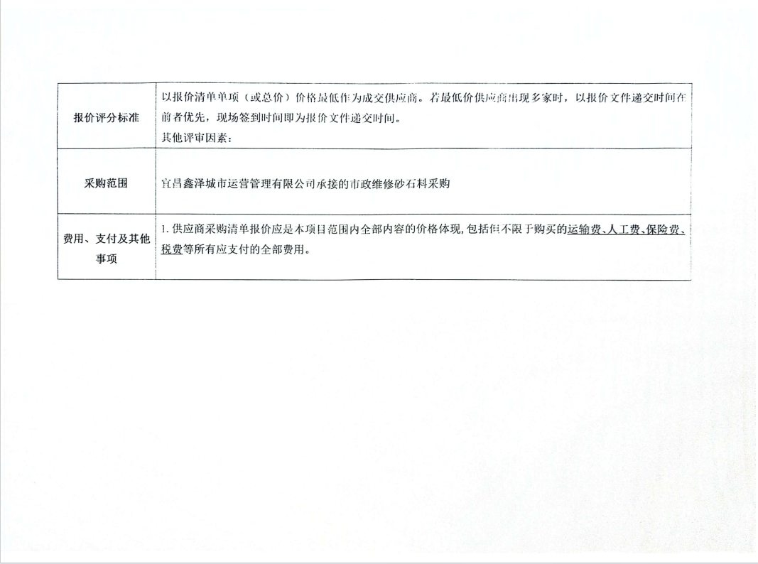 宜昌鑫澤城市運(yùn)營管理有限公司市政維修砂石料采購項(xiàng)目詢價(jià)公告