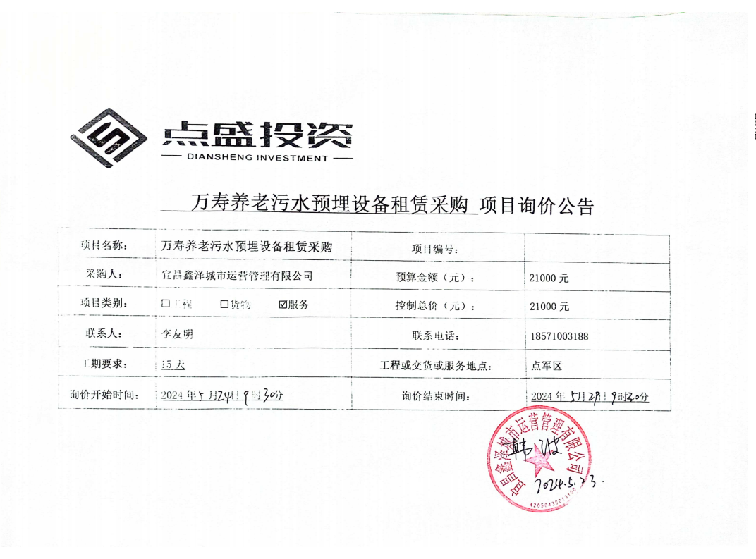 萬壽養(yǎng)老污水預(yù)埋設(shè)備租賃采購詢價(jià)公告