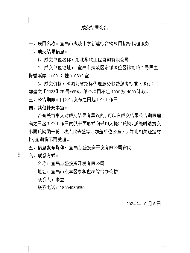 宜昌市夷陵中學(xué)新建綜合樓項目招標代理服務(wù)成交公告