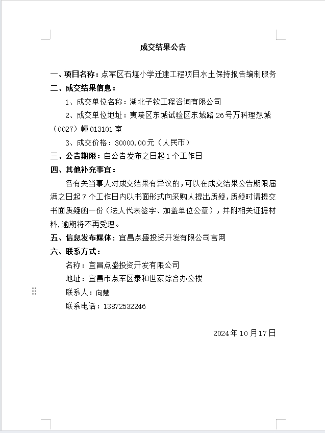 點(diǎn)軍區(qū)石堰小學(xué)遷建工程項(xiàng)目水土保持報(bào)告編制服務(wù)成交公告