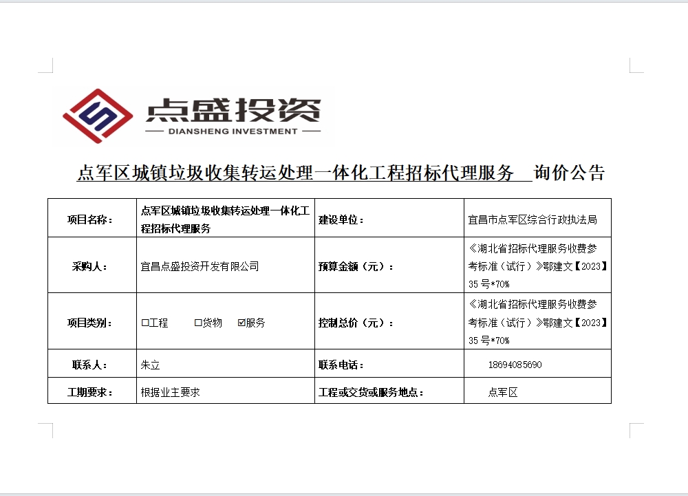 點軍區(qū)城鎮(zhèn)垃圾收集轉運處理一體化工程招標代理服務詢價公告