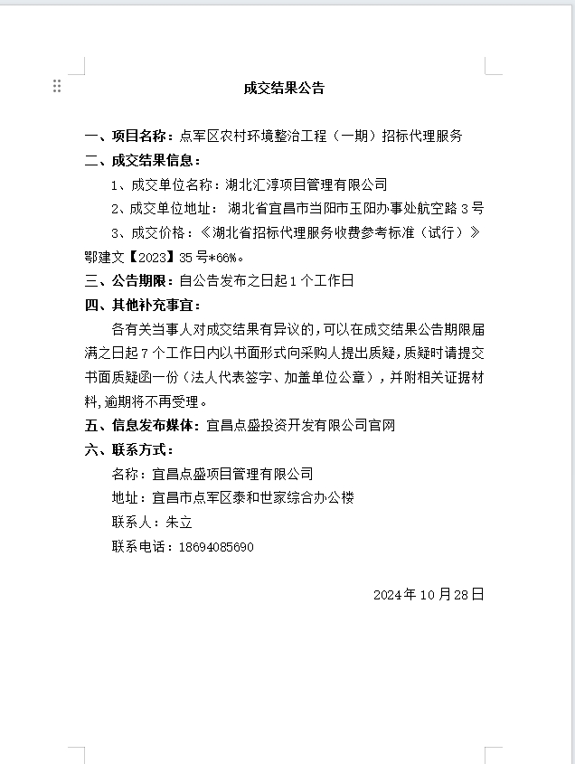 點軍區(qū)農(nóng)村環(huán)境整治工程(一期)招標(biāo)代理服務(wù)成交公告