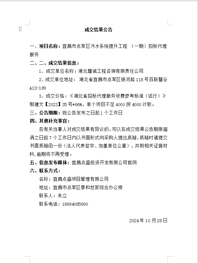 宜昌市點軍區(qū)污水系統(tǒng)提升工程 (一期)招標代理服務(wù)成交公告