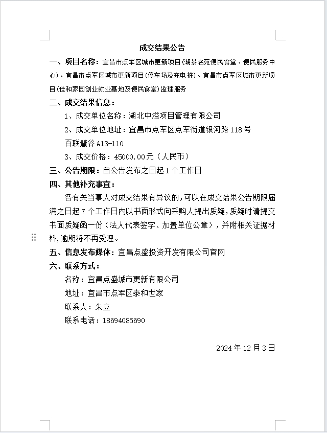 宜昌市點(diǎn)軍區(qū)城市更新項(xiàng)目(湖景名苑便民食堂、便民服務(wù)中心)、宜昌市點(diǎn)軍區(qū)城市更新項(xiàng)目(停車場(chǎng)及充電樁)、宜昌市點(diǎn)軍區(qū)城市更新項(xiàng)目(佳和家園創(chuàng)業(yè)就業(yè)基地及便民食堂)監(jiān)理服務(wù)成交公告