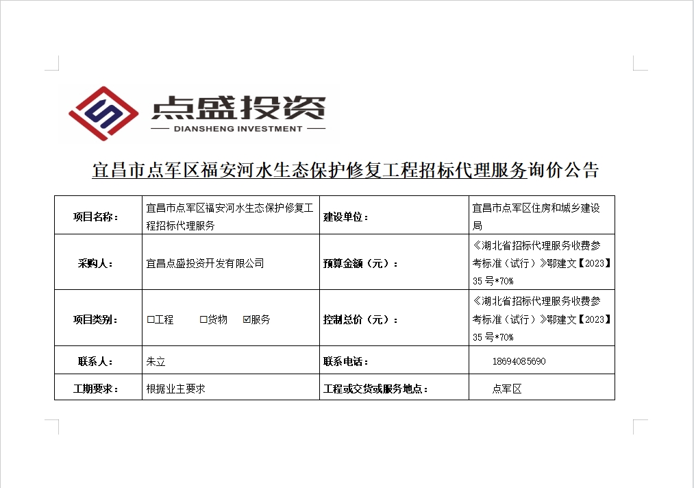 宜昌市點(diǎn)軍區(qū)福安河水生態(tài)保護(hù)修復(fù)工程招標(biāo)代理服務(wù)詢價公告