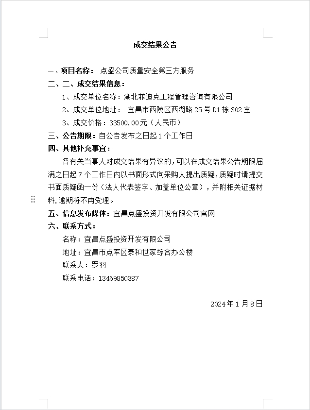 點(diǎn)盛公司質(zhì)量安全第三方服務(wù)成交公告