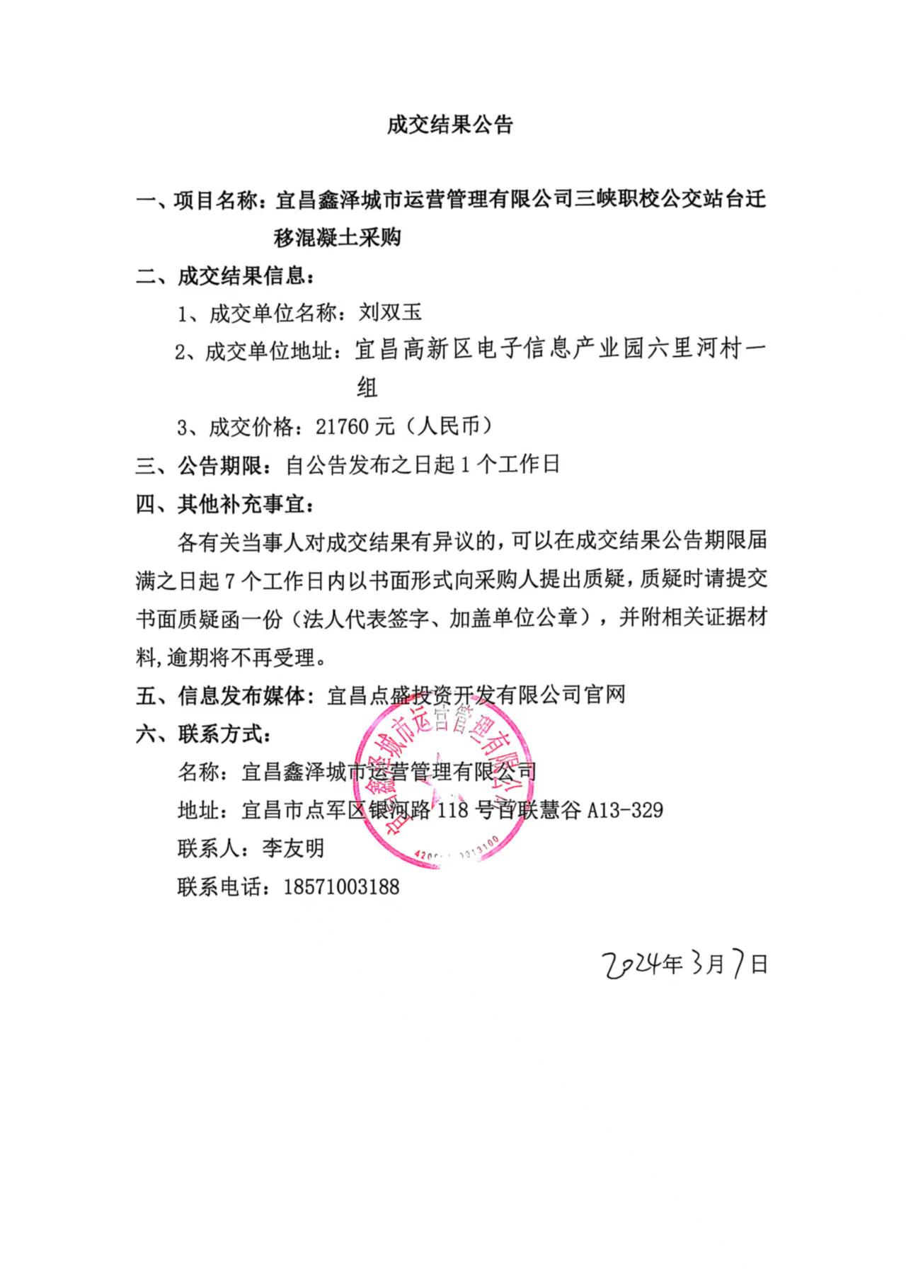 三峽職校公交站臺(tái)遷移混凝土采購成交公告